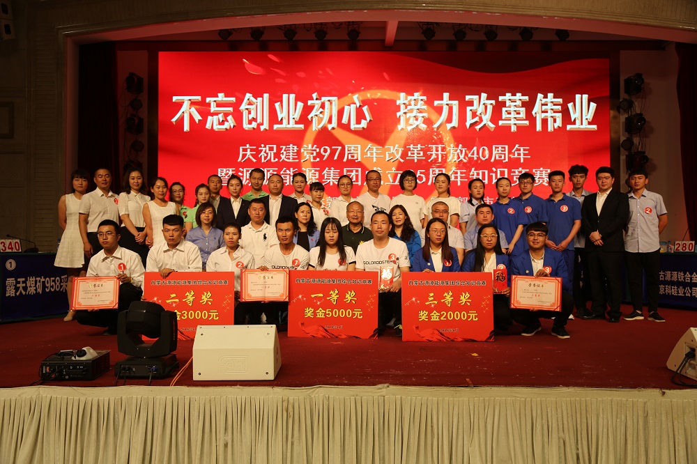 舉辦主題為"不忘創(chuàng)業(yè)初心 接力改革偉業(yè)"黨建知識與企業(yè)文化知識相結(jié)合的大型知識競賽活動,霍市領(lǐng)導(dǎo)、集團(tuán)領(lǐng)導(dǎo)與獲獎單位選手合影留念。