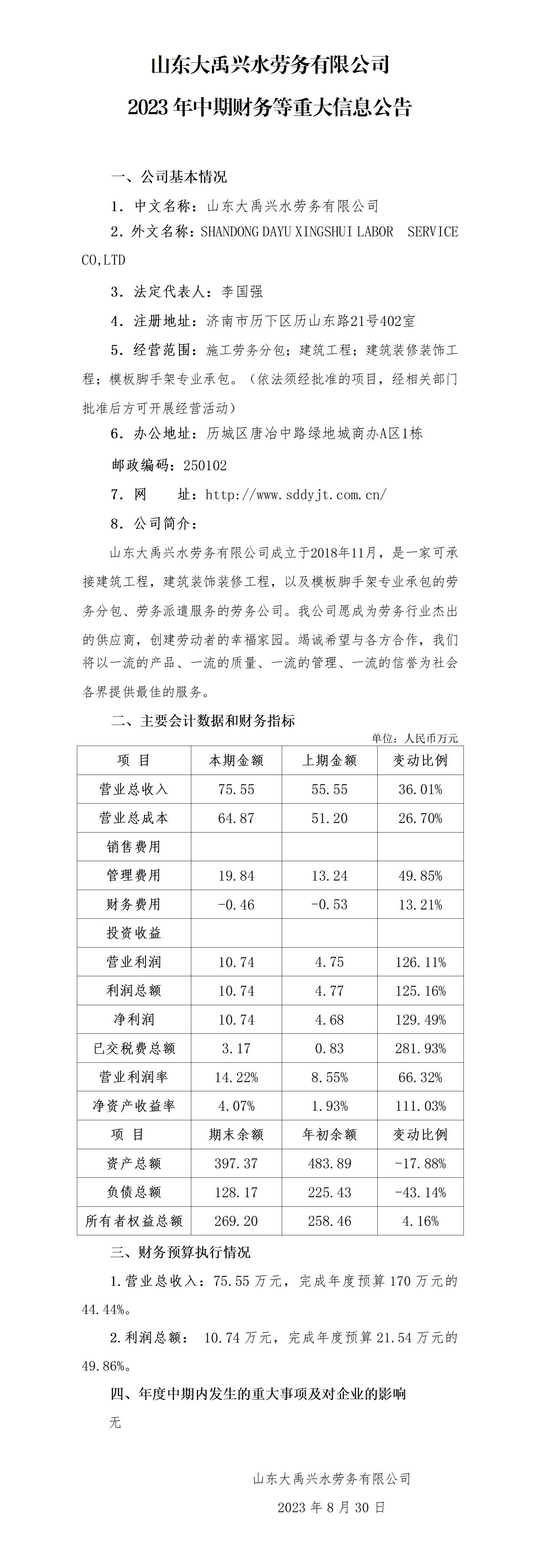山東大禹興水勞務有限公司2023年中期財務等重大信息公告
