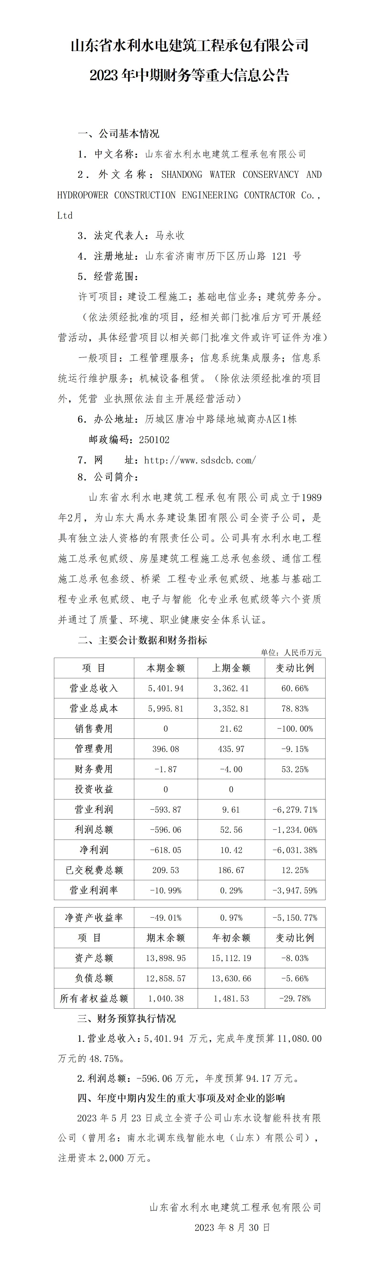 山東省水利水電建筑工程承包有限公司2023年中期財(cái)務(wù)等重大信息公告