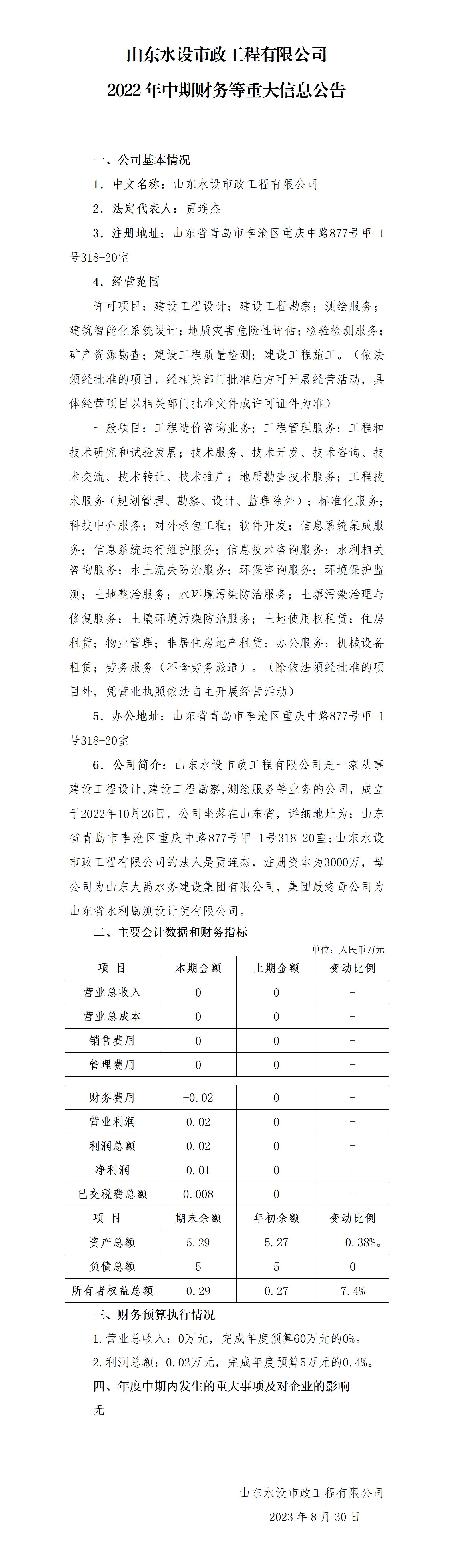 山東水設市政工程有限公司2022年中期財務等重大信息公告