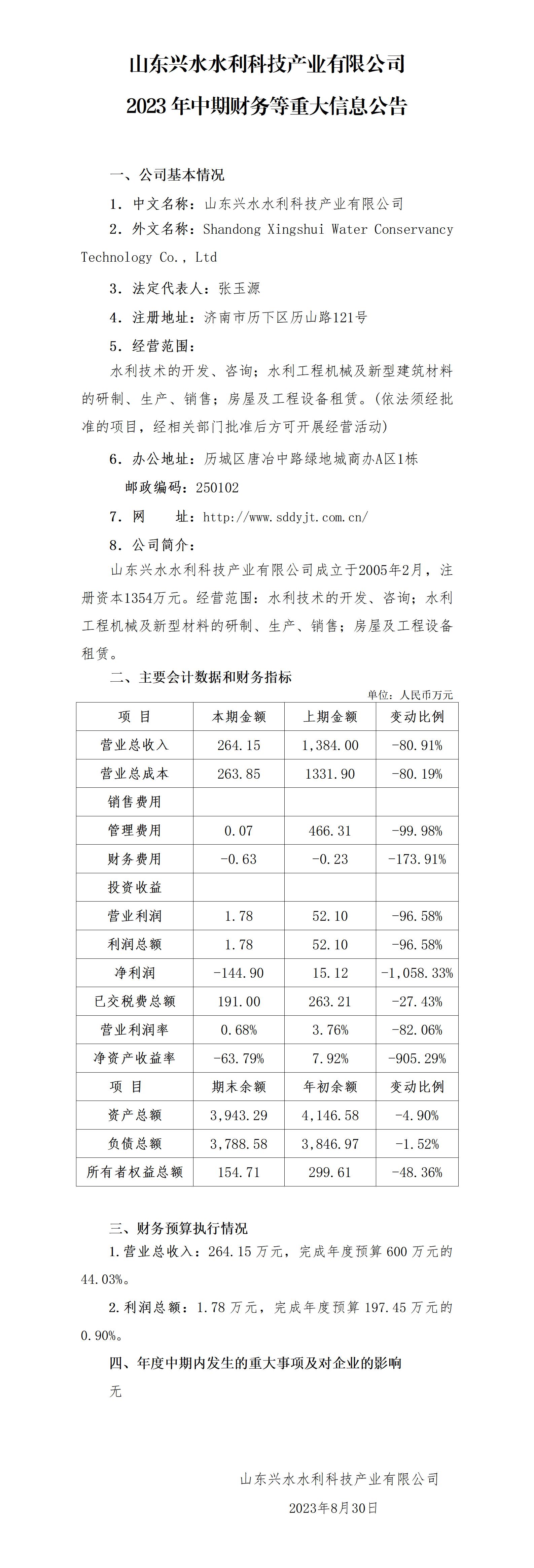 山東興水水利科技產業有限公司2023年中期財務等重大信息公告