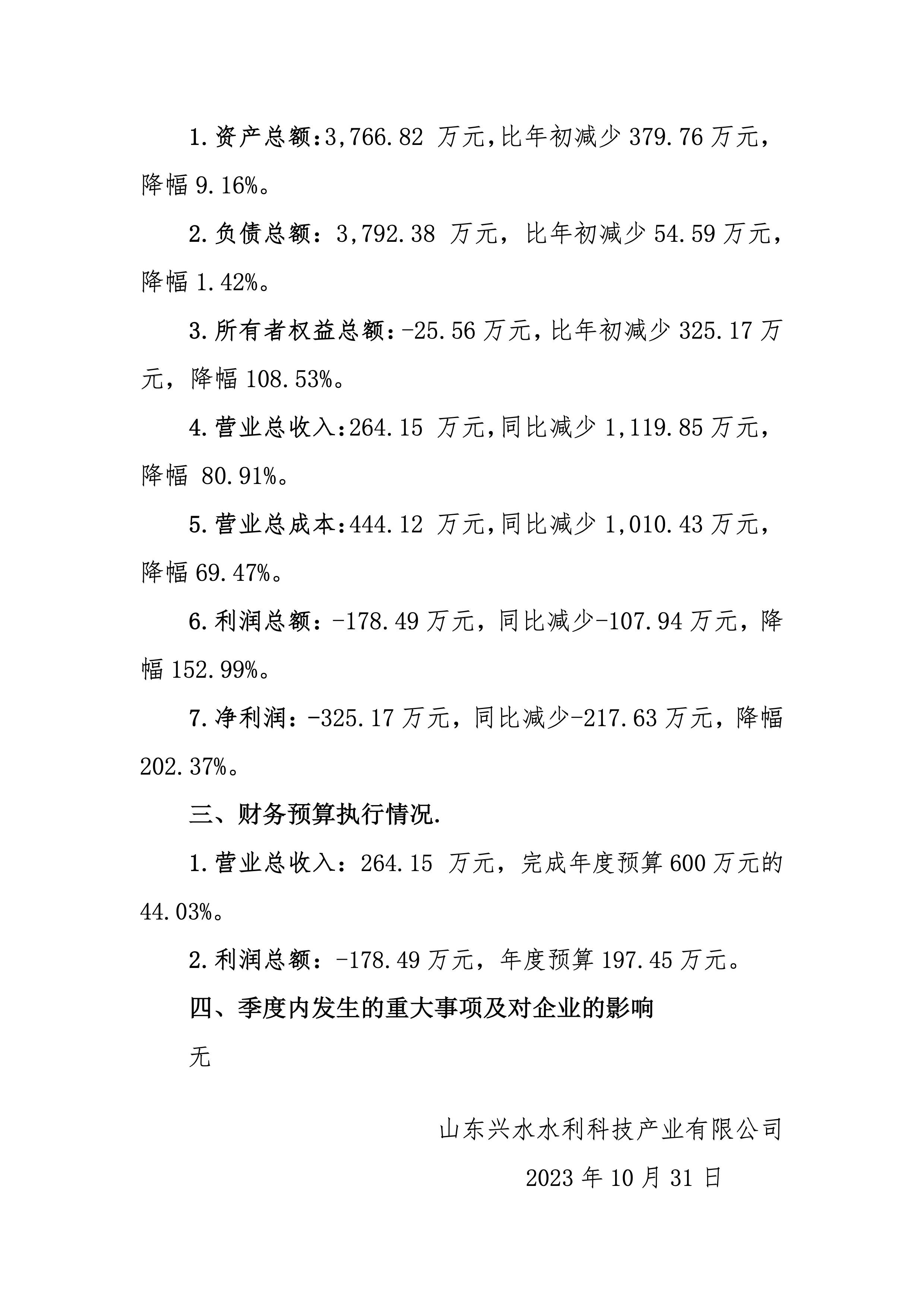 山東興水水利科技產業有限公司2023年第三季度財務信息公告