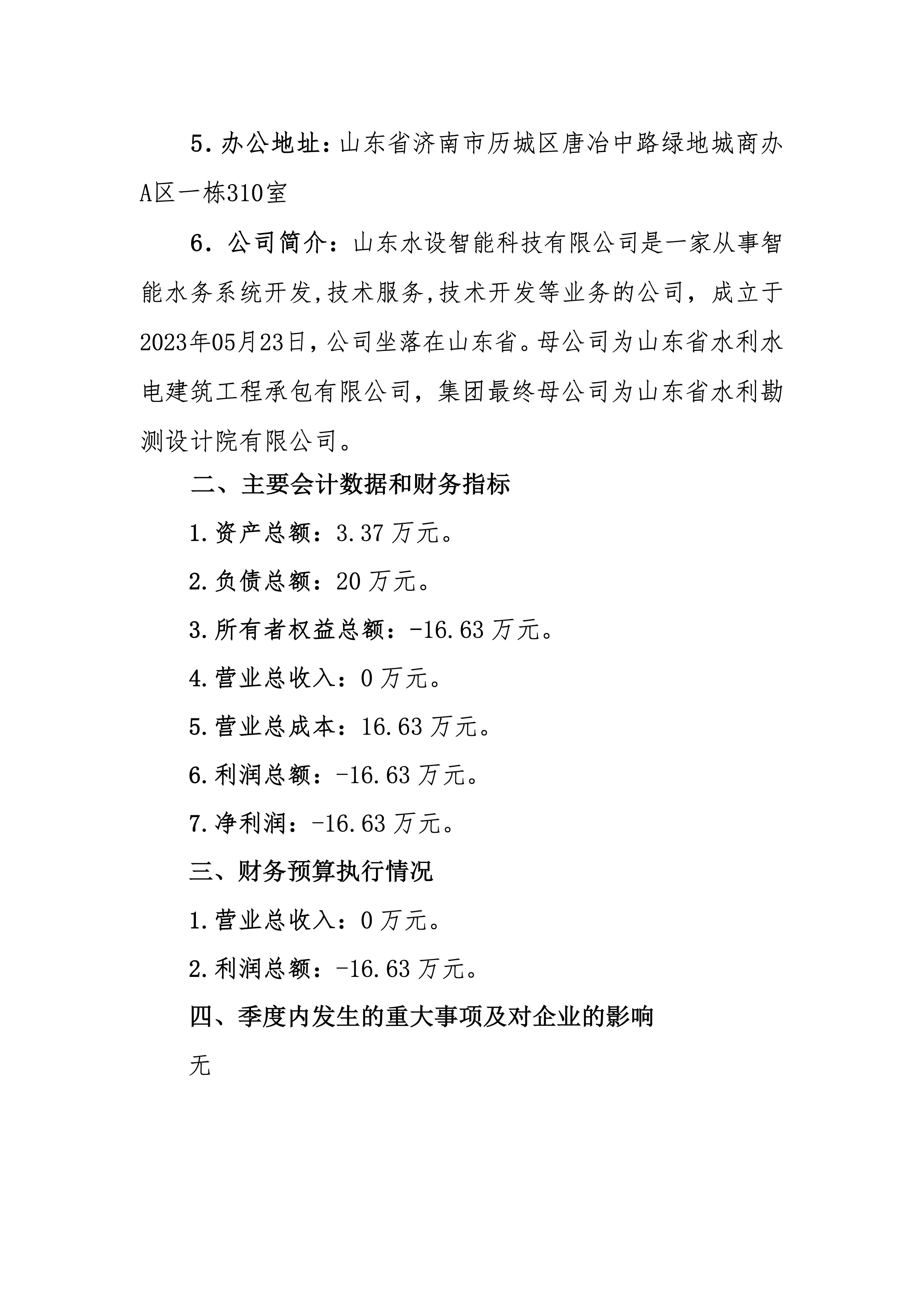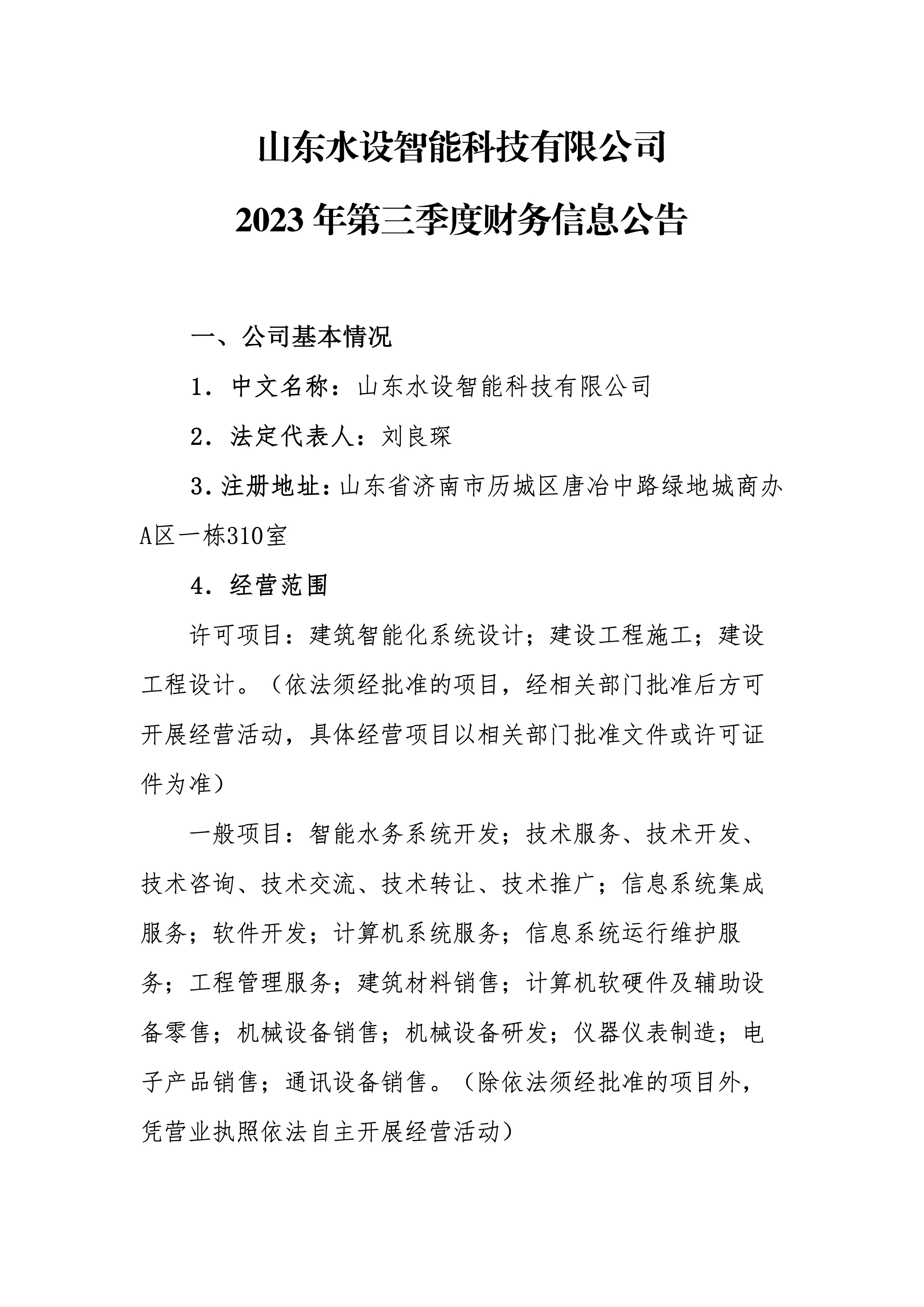 山東水設智能科技有限公司2023年第三季度財務信息公告