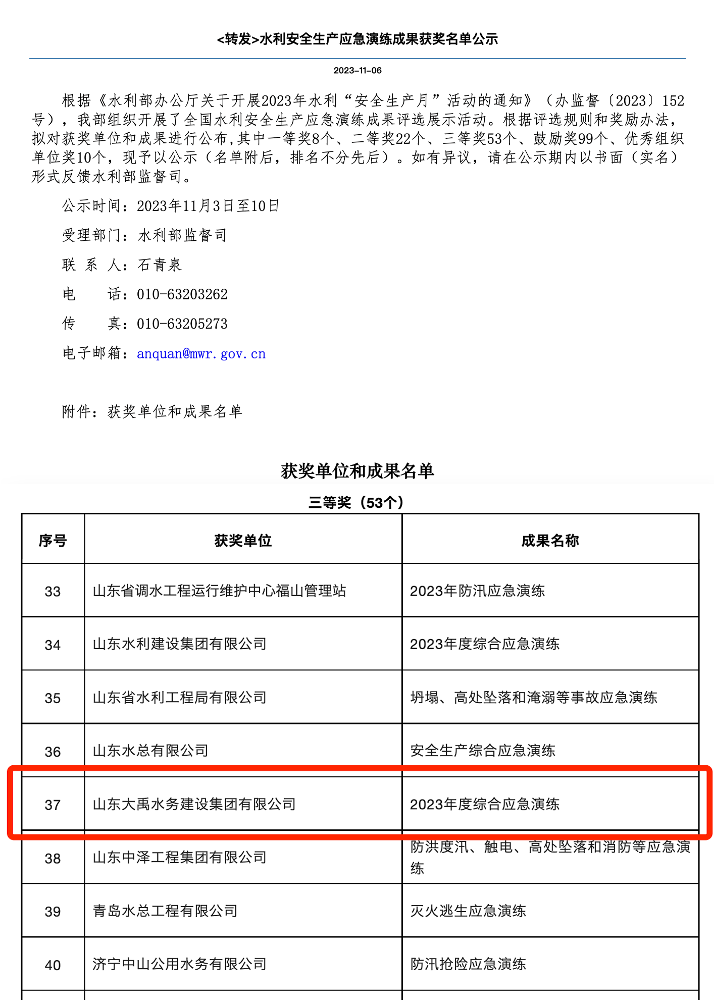 近日,2023年全國水利安全生產(chǎn)應(yīng)急演練成果評選展示活動獲獎名單揭曉,集團(tuán)公司參賽作品“2023年度綜合應(yīng)急演練”榮獲三等獎。