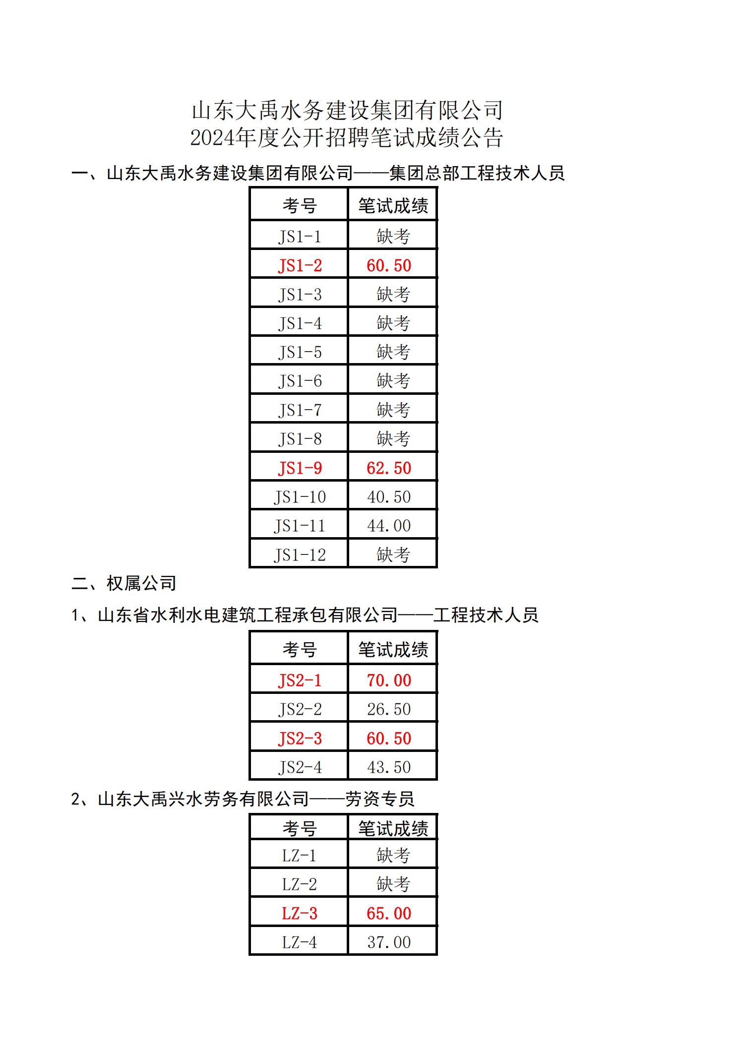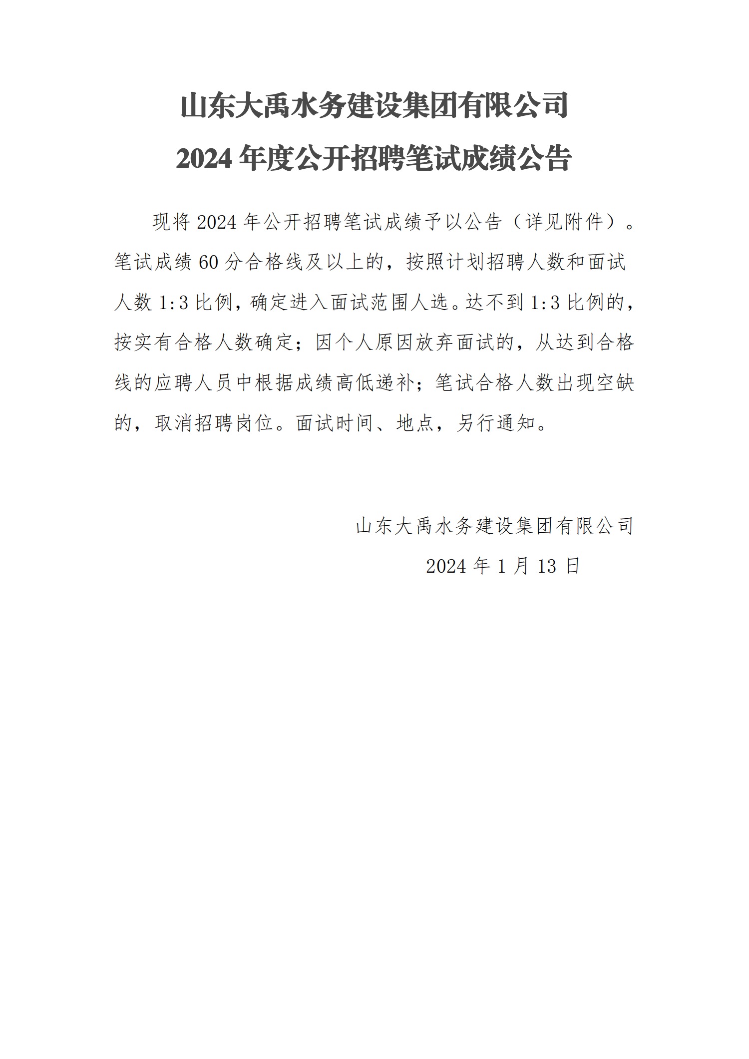 山東大禹水務(wù)建設(shè)集團(tuán)有限公司2024年度公開招聘筆試成績公告