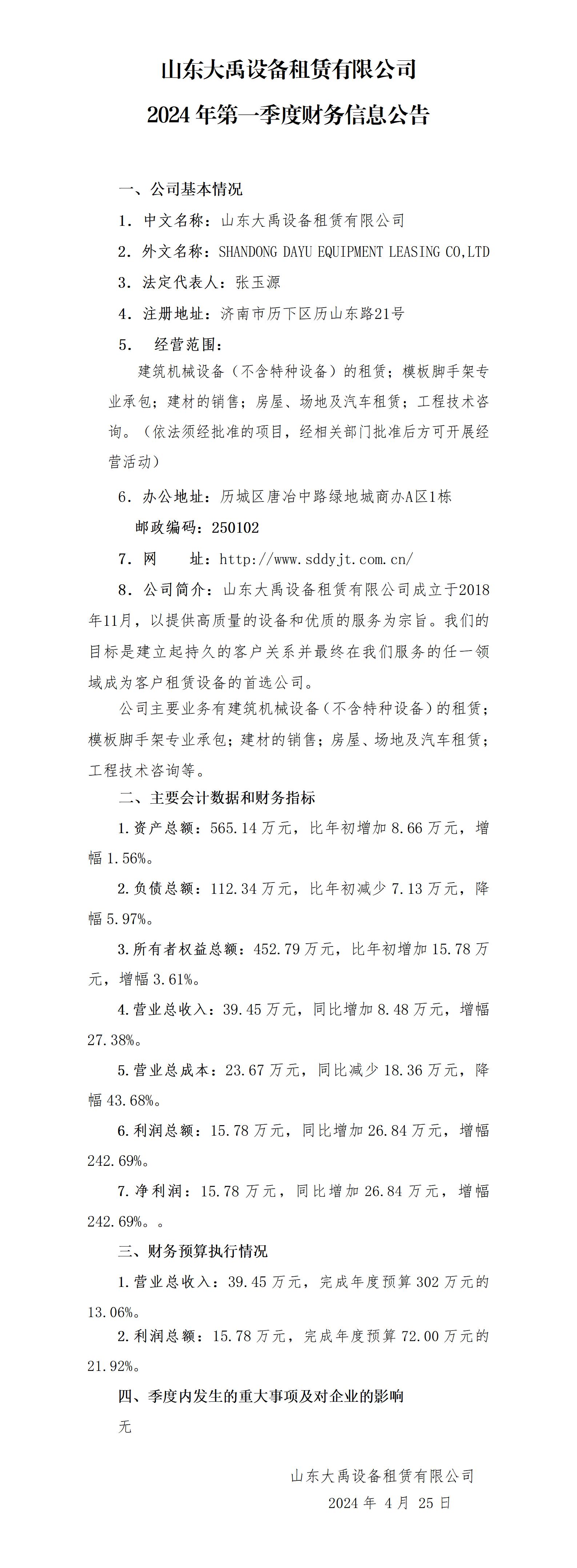山東大禹設(shè)備租賃有限公司2024年第一季度財務(wù)信息公告