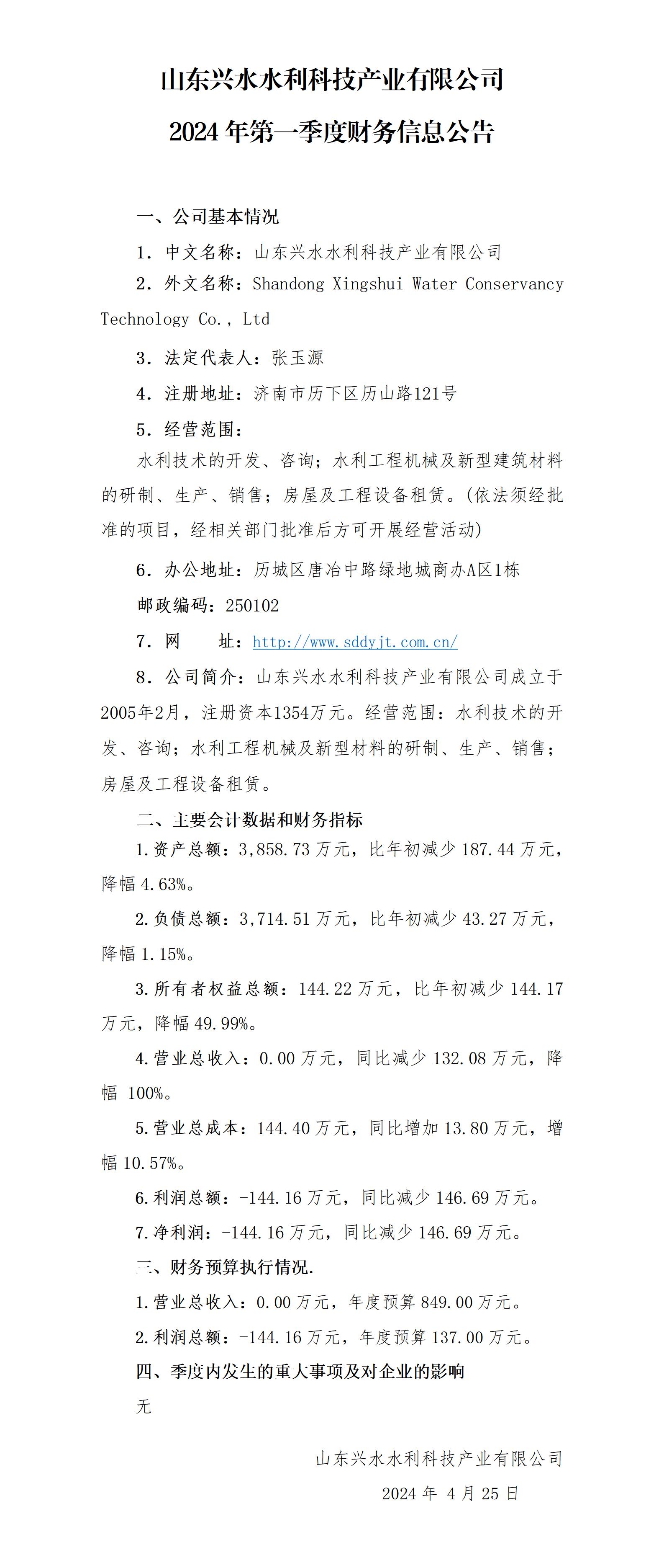 山東興水水利科技產(chǎn)業(yè)有限公司2024年第一季度財務信息公告