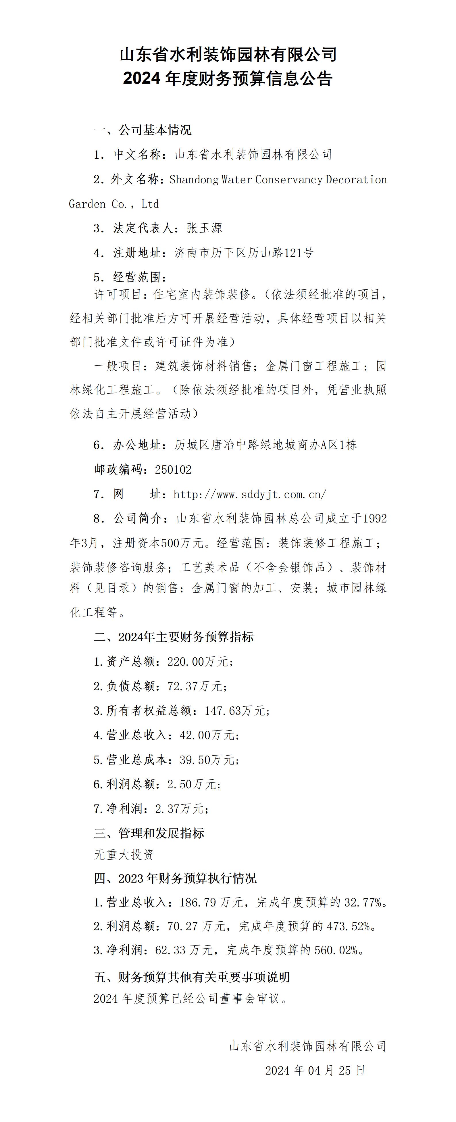 山東省水利裝飾園林有限公司2024年度財(cái)務(wù)預(yù)算信息公告