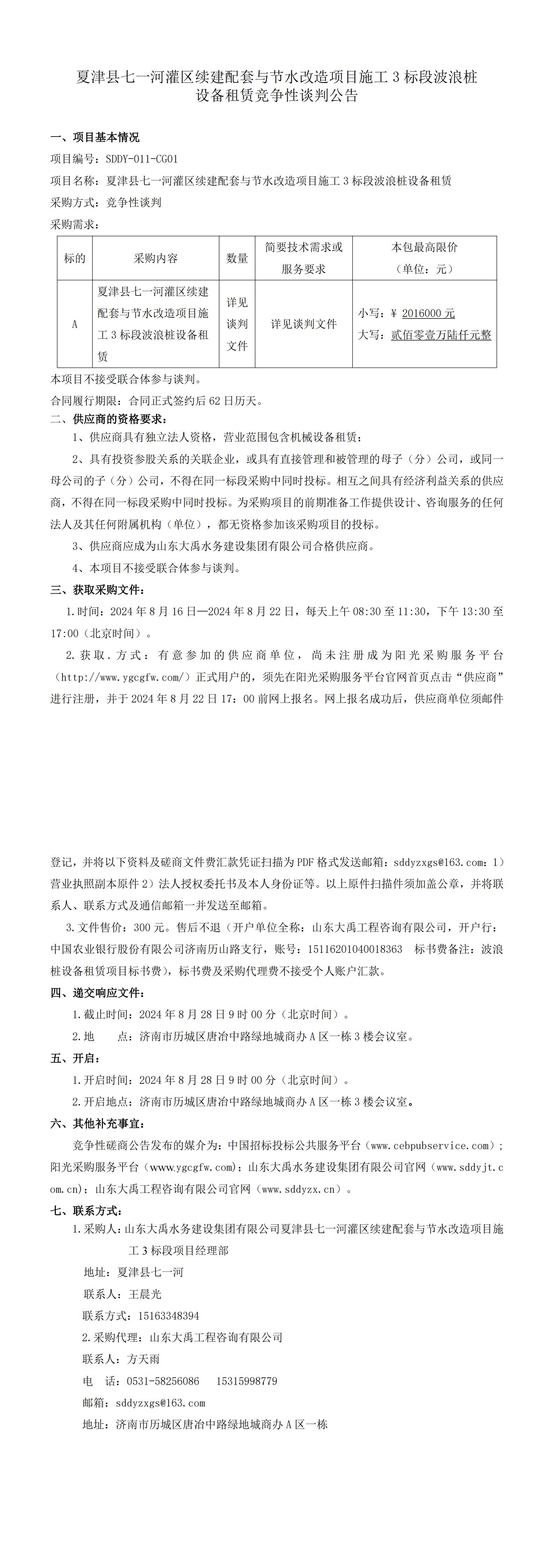 夏津縣七一河灌區(qū)續(xù)建配套與節(jié)水改造項(xiàng)目施工 3 標(biāo)段波浪樁 設(shè)備租賃競(jìng)爭(zhēng)性談判公告
