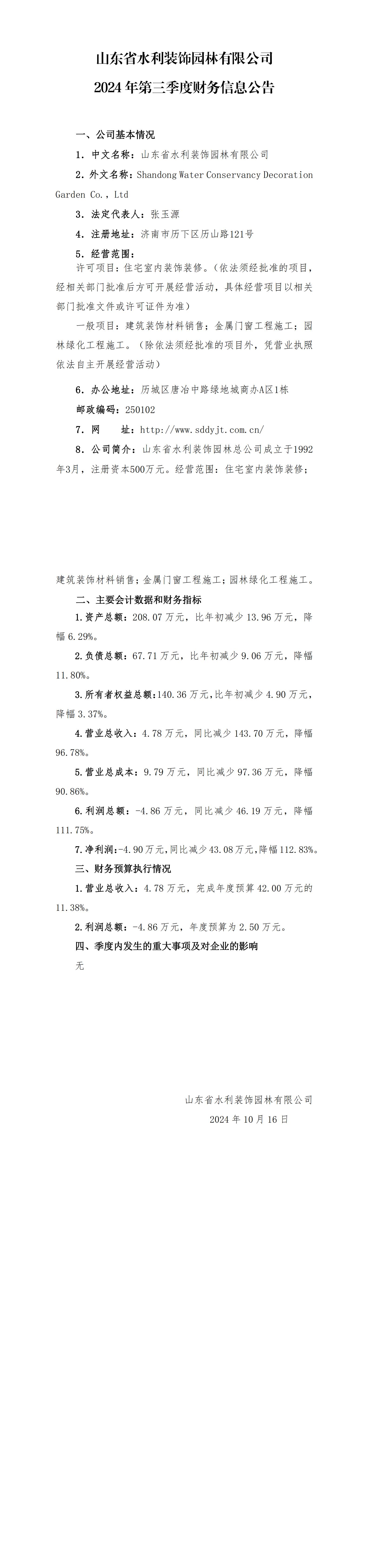 山東省水利裝飾園林有限公司2024年第三季度財(cái)務(wù)信息公告