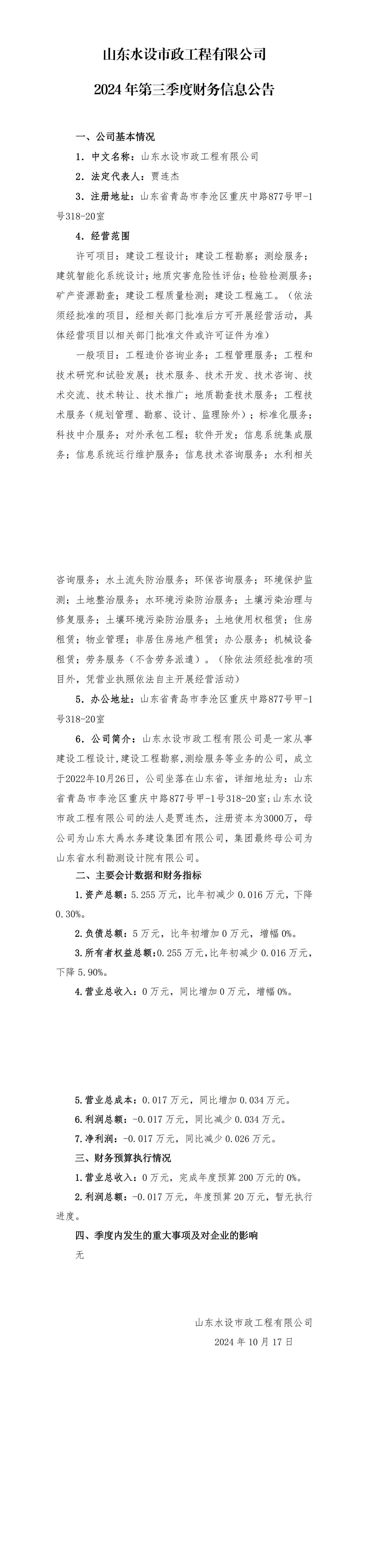 山東水設(shè)市政工程有限公司2024年第三季度財(cái)務(wù)信息公告