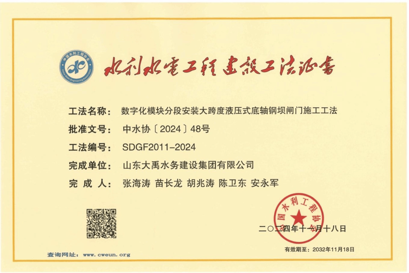 近日,集團公司申報的《數(shù)字化模塊分段安裝大跨度液壓式底軸鋼壩閘門施工工法》《復(fù)雜環(huán)境小凈距穿越管道群大直徑頂管施工工法》《大型多跨精確留槽錨固充水式橡膠壩施工工法》《穿越高鐵運營線強風(fēng)化巖基底輸水鋼管施工工法》等四項工法獲評中國水利工程協(xié)會“2024年度水利行業(yè)工法”。