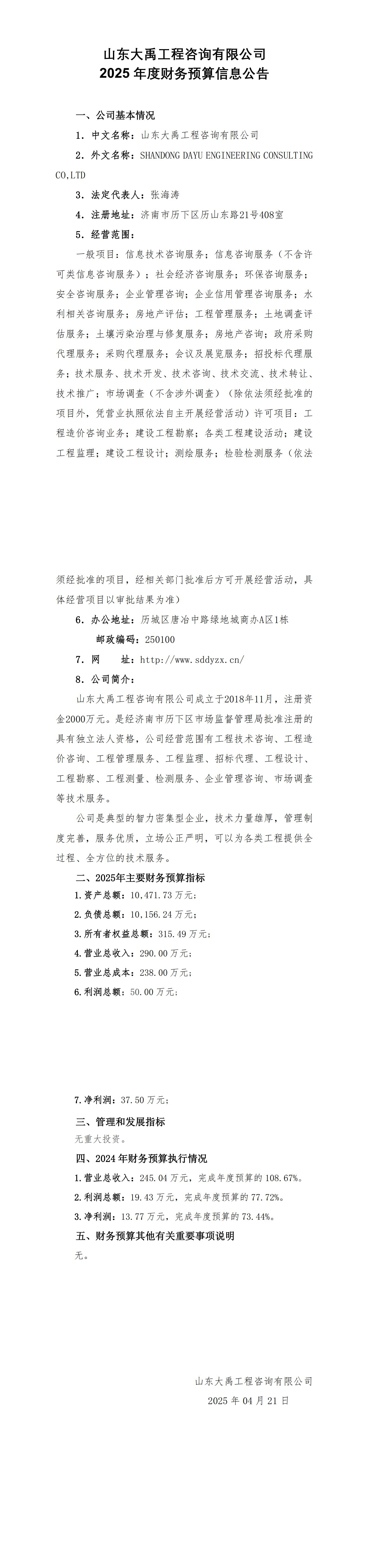 山東大禹工程咨詢有限公司2025年度財(cái)務(wù)預(yù)算信息公告