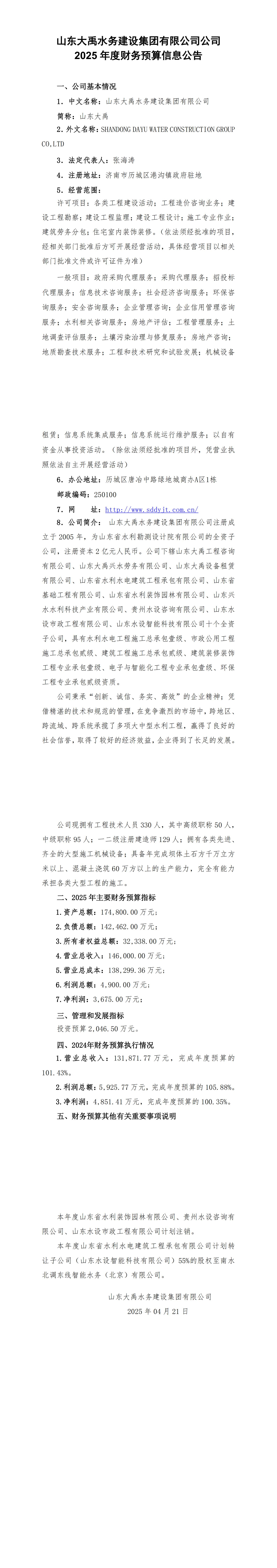 山東大禹水務建設集團有限公司2025年度財務預算信息公告