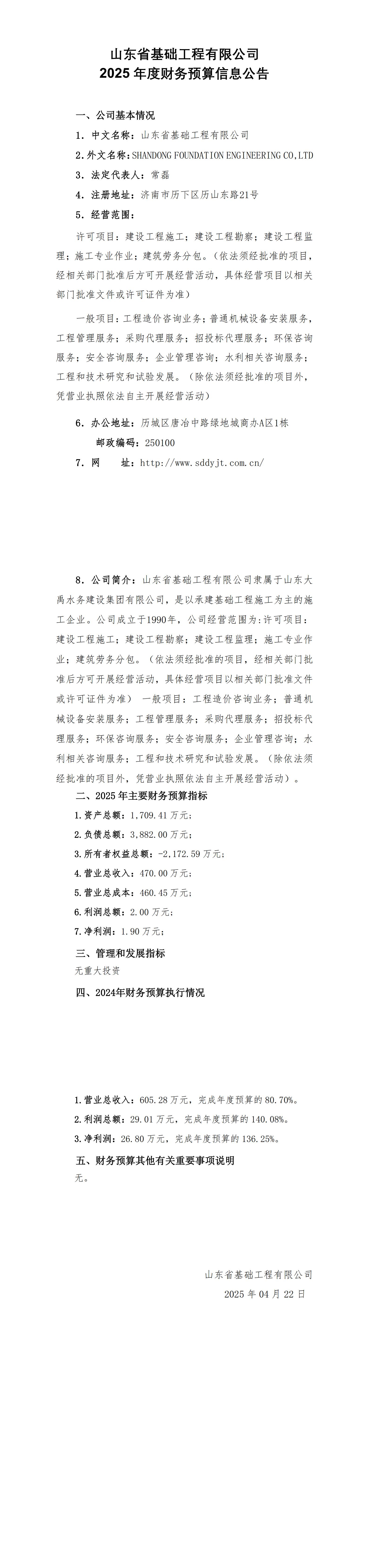 山東省基礎工程有限公司2025年度財務預算信息公告
