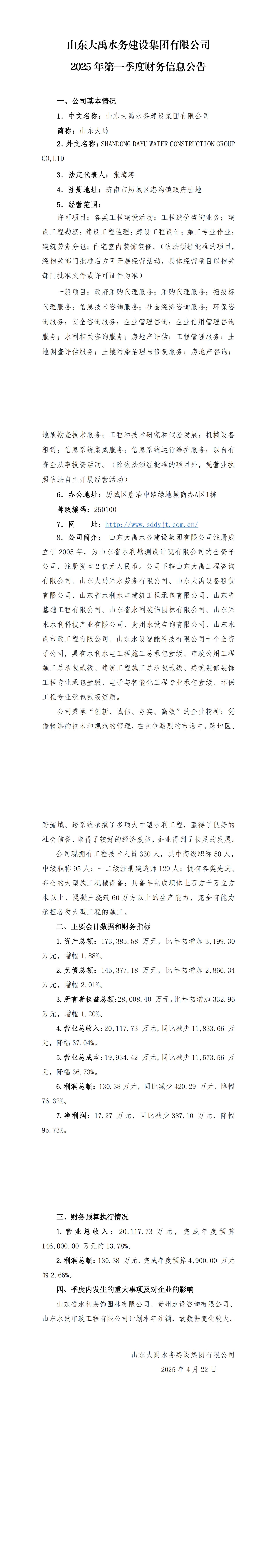山東大禹水務建設集團有限公司2025年第一季度財務信息公告