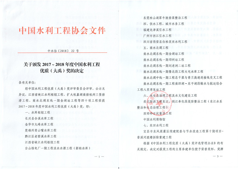 根據(jù)《中國(guó)水利工程優(yōu)質(zhì)(大禹)獎(jiǎng)評(píng)選管理辦法》的有關(guān)規(guī)定,公司承建的南水北調(diào)東線一期魯北段工程大屯水庫(kù)工程順利通過(guò)大禹獎(jiǎng)評(píng)選,榮獲2017~2018年度中國(guó)水利工程優(yōu)質(zhì)(大禹)獎(jiǎng)。