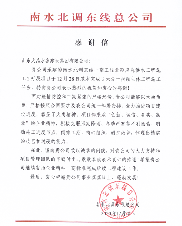 2020年12月28日南水北調東線總公司對集團公司發來感謝信,對六分干襯砌主體工程完工表示熱烈祝賀和感謝,對管理人員的辛勤付出與默默奉獻給予了充分的肯定。集團公司將以此為契機,續發揚艱苦奮斗的優良作風,弘揚 “創新、誠信、務實、高效”的企業精神,高標準完成后續工程,為南水北調事業貢獻力量。(供稿:侯暢 責任編輯:高秋雨)