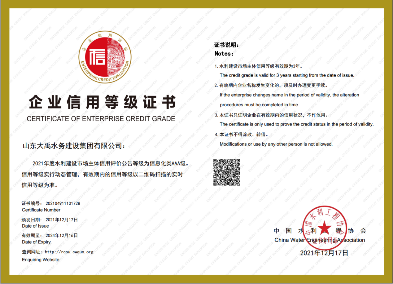近日,大禹集團(tuán)喜獲2021年度水利建設(shè)市場主體(供貨、信息化單位)信用評價(jià)AAA等級,在信用評價(jià)領(lǐng)域取得又一驕人成績。